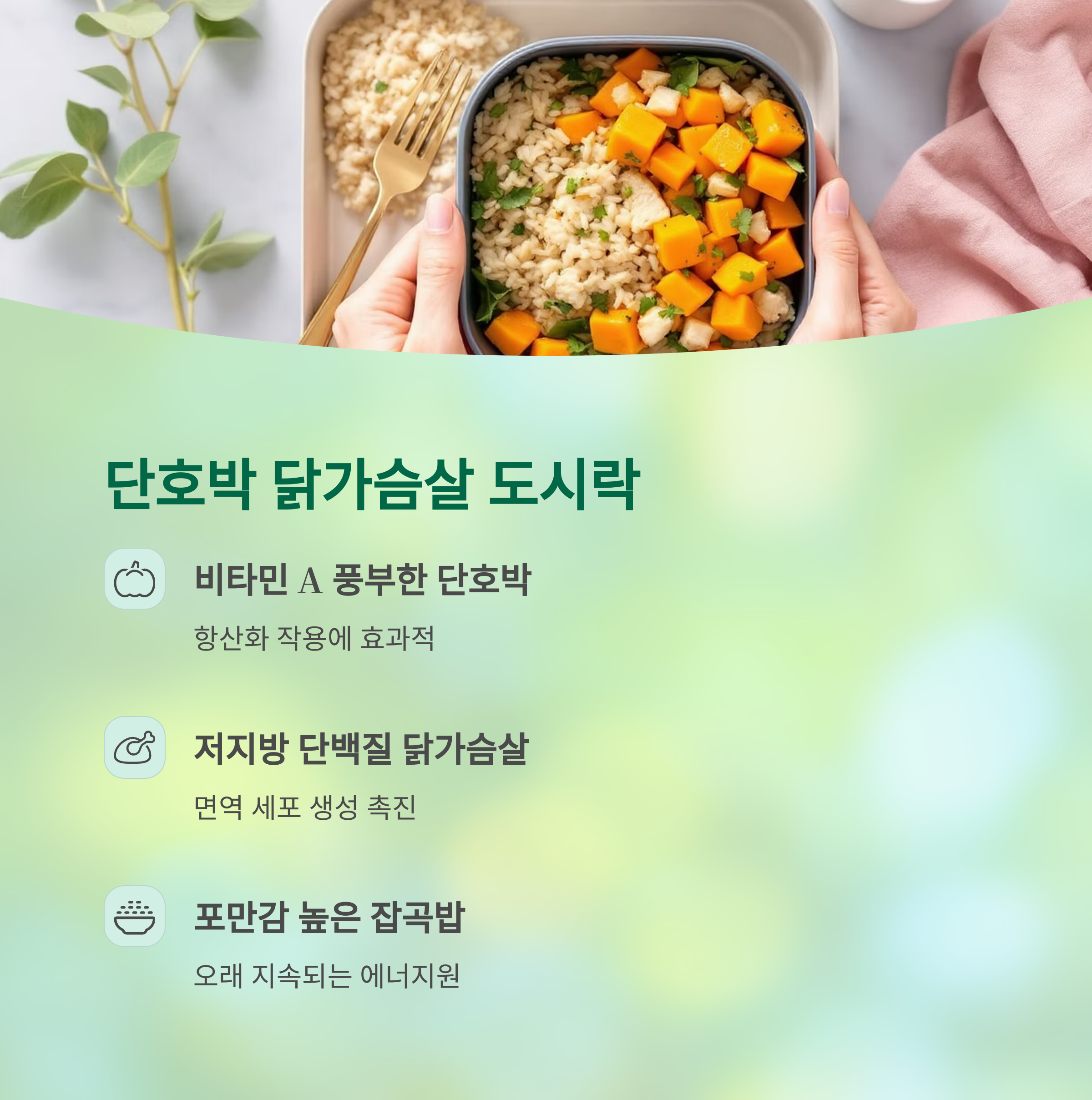 부드러운 단호박과 닭가슴살은 고단백·고식이섬유 도시락의 대표 조합입니다