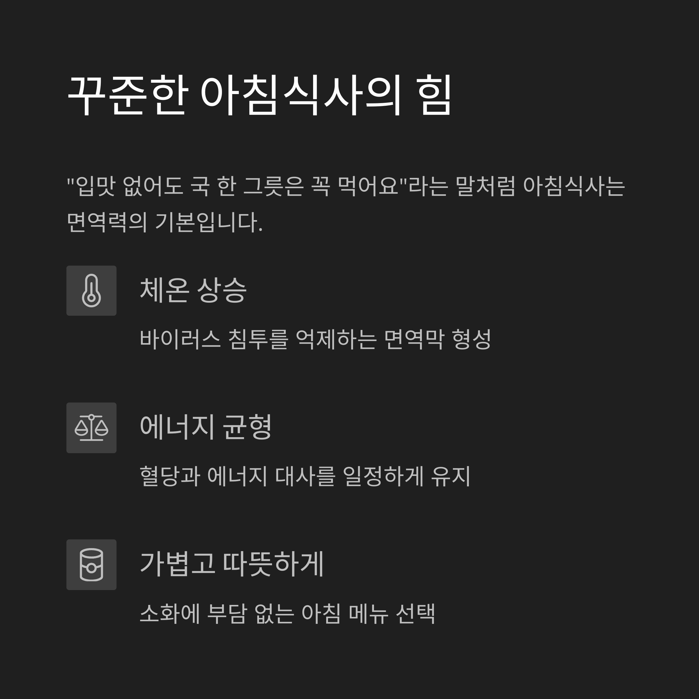 아침 메뉴는 가볍고 따뜻하게 구성하는 것이 좋습니다