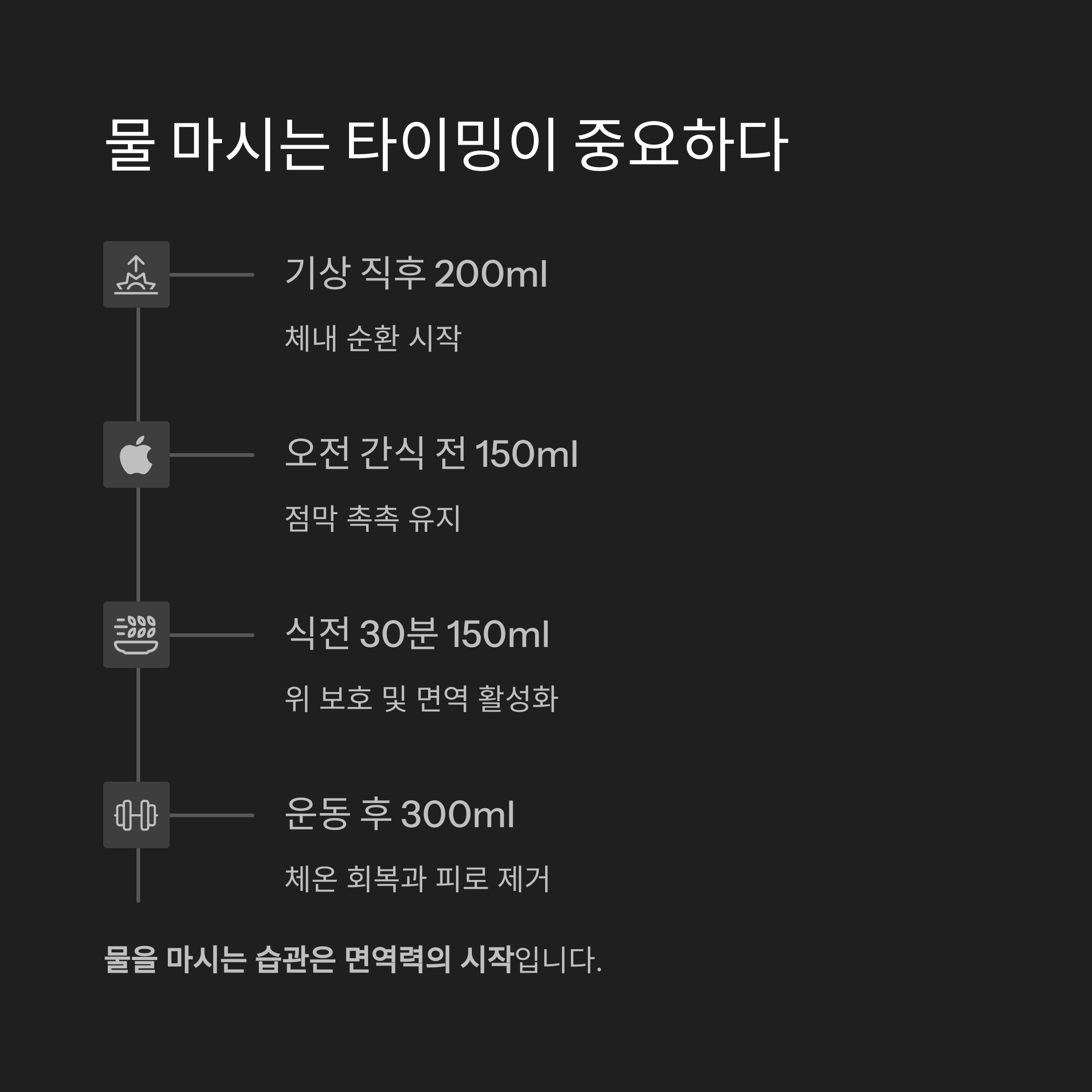 | 기상 직후 | 200ml | 체내 순환 시작 |