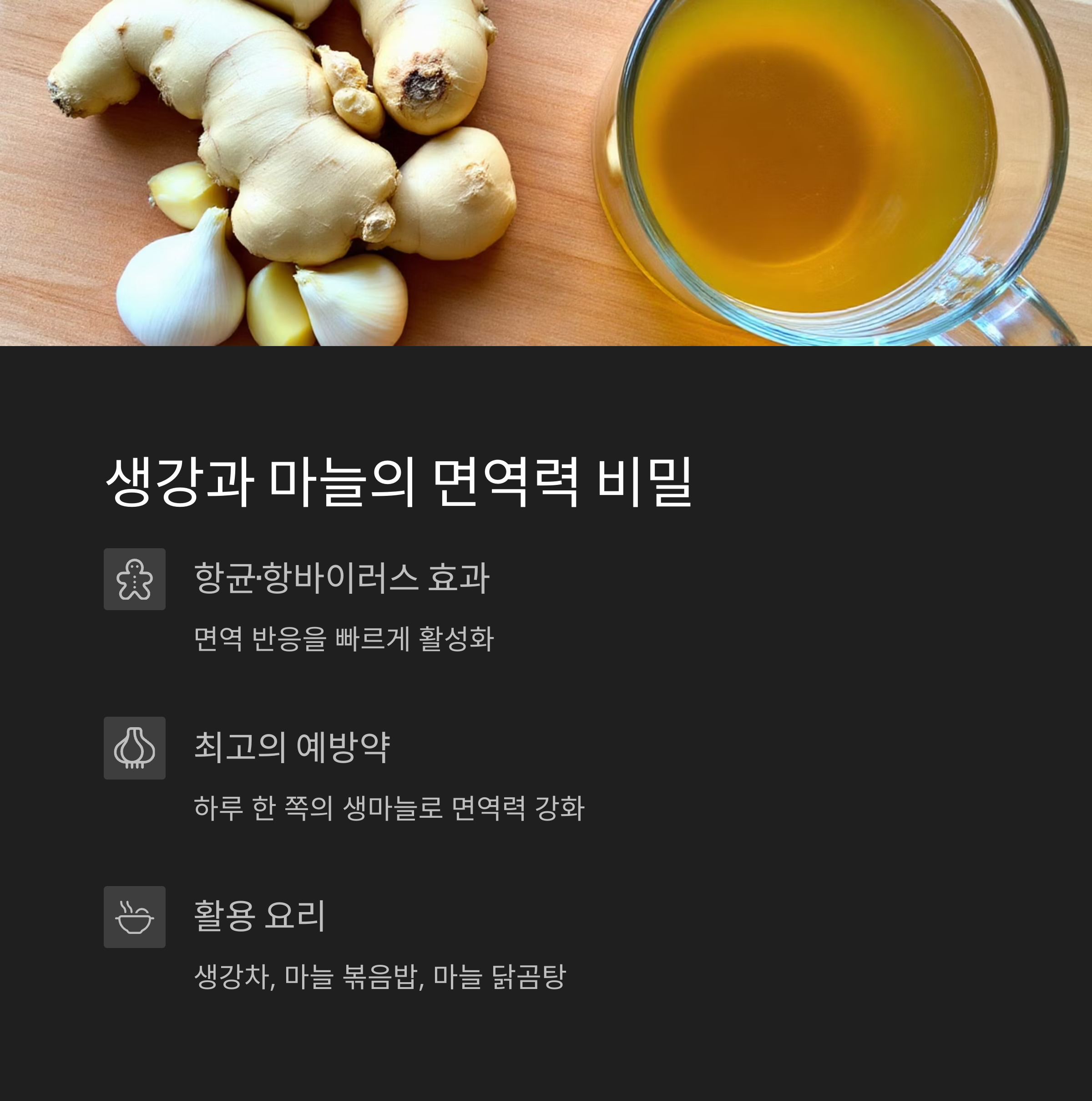 요리 예시로는 생강차, 마늘 볶음밥, 마늘 듬뿍 닭곰탕 등이 있습니다