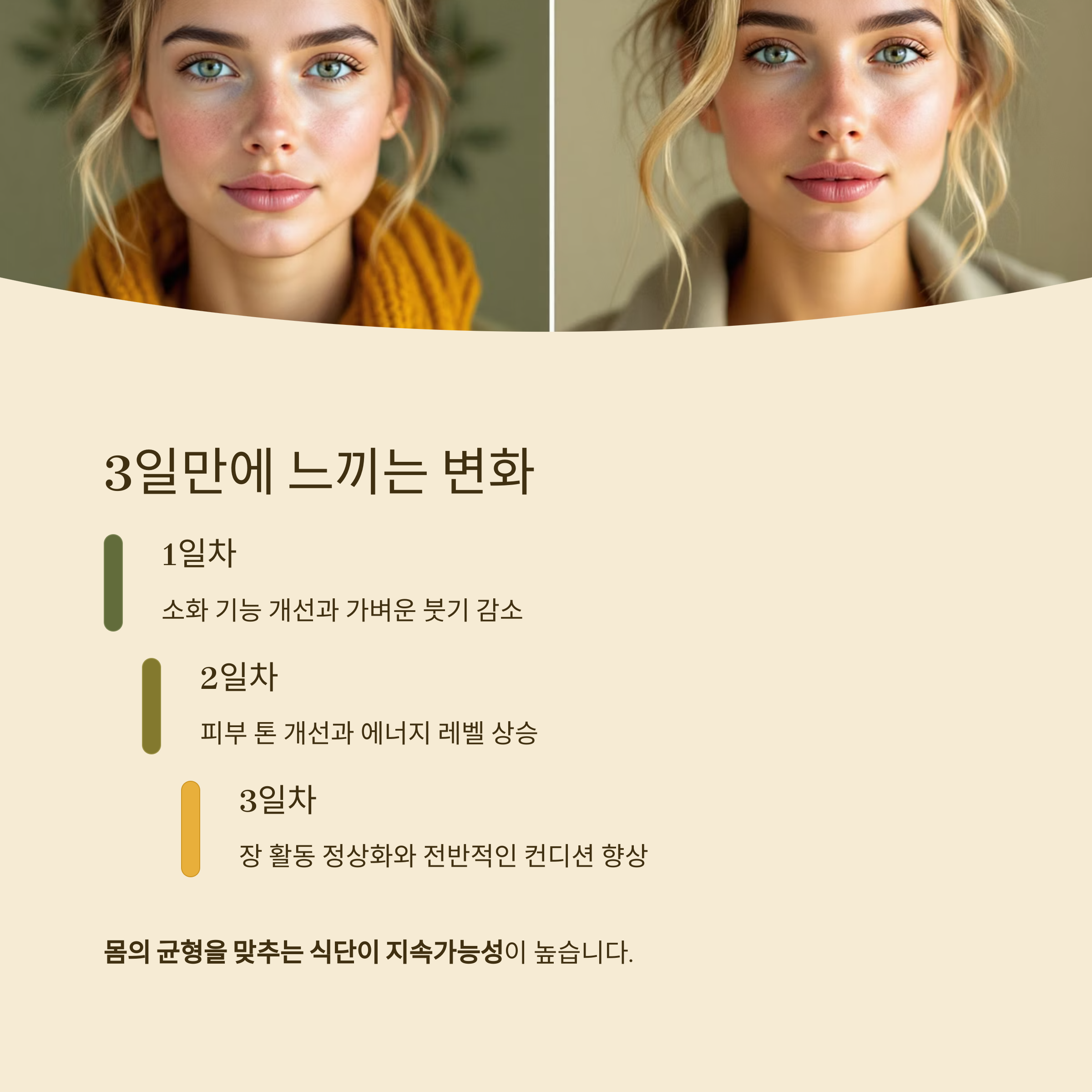 붓기 감소, 피부 맑아짐, 장 활동 개선 등이 대표적인 변화입니다